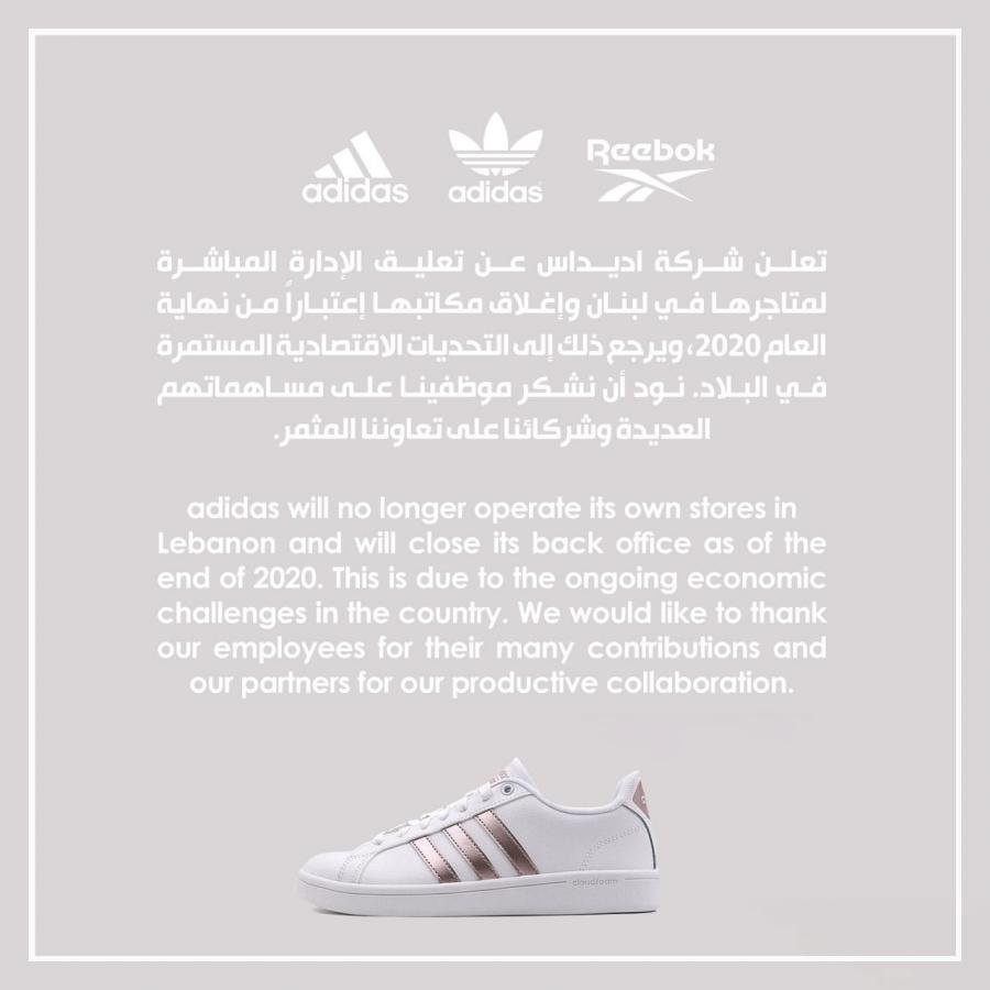 علقت شركة “اديداس” إدارتها المباشرة لمتاجرها في لبنان، وستعمد إلى إغلاق مكاتبها اعتباراً من نهاية العام 2020.
