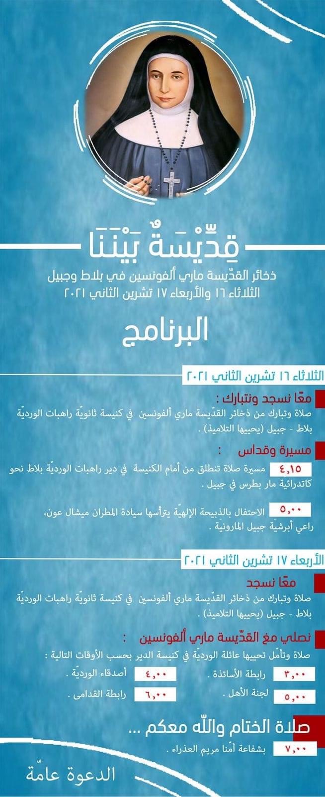 تستقبل أبرشيّة جبيل المارونيّة ذخائر القديسة ماري ألفونسين يوميّ الثلاثاء ١٦ والأربعاء ١٧ تشرين الثاني ٢٠٢١.