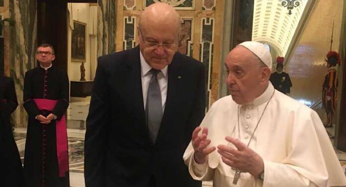 فقد دعا البابا فرنسيس خلال استقباله ميقاتي وافراد عائلته الى «تعاون جميع اللبنانيين من أجل انقاذ وطنهم، وطن الرسالة»، كما وصفه سلفه القديس يوحنا بولس الثاني. كما دعا الى «ان يستعيد لبنان دوره كنموذج للحوار والتلاقي بين الشرق والغرب». وقال: «هموم لبنان كثيرة وانا سأحمله في صلاتي من اجل ان يخلصه الله من كل الازمات».