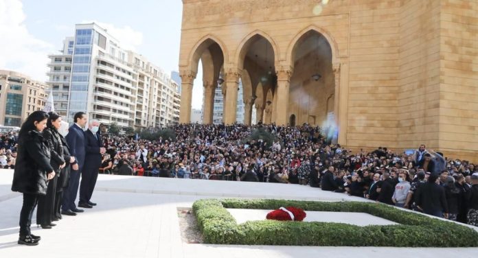 وأضيئت الشعلة الموجودة في مكان استشهاد الرئيس رفيق الحريري في منطقة السان جورج، وعزفت موسيقى كشافة لبنان المستقبل لحن الموتى والنشيد الوطني مع التحية.