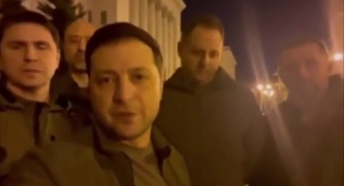نشر الرئيس الأوكراني فولوديمير زيلينسكي فيديو يظهر فيه مع رئيس الوزراء وقيادة الصف الأول، للتأكيد على أنهم موجودون في العاصمة كييف، مؤكّدين على “القتال حتى النهاية”.