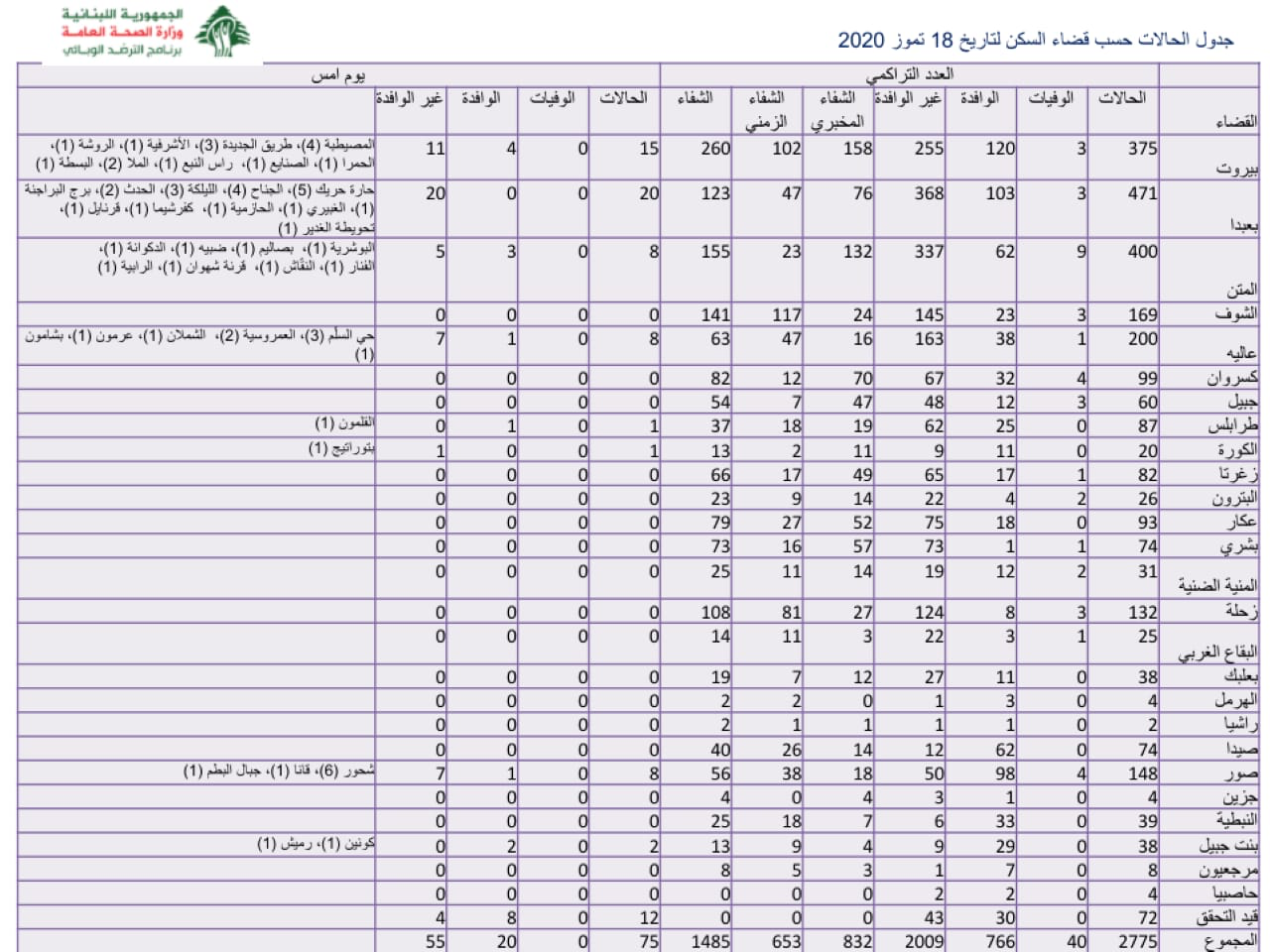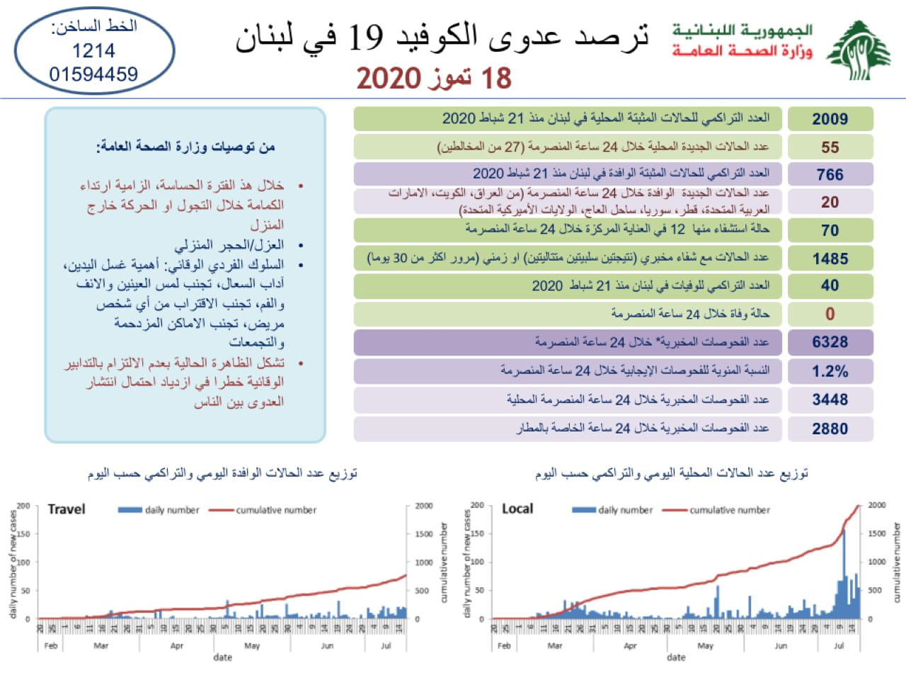 أبرز العناوينوزارة الصحة: 75 اصابة كورونا جديدة صحّةوزارة الصحة: 75 اصابة كورونا جديدة20:02 2020 ,July 180400 اعلنت وزارة الصحة العامة تسجيل 75 اصابة كورونا جديدة رفعت العدد التراكمي للحالات المثبتة الى 2775. FacebookTwitterPinterestWhatsAppTelegram الخبر السابق بالصور : اقبال كثيف على برادات اللحوم في السوبرماركات في جبيلالخبر التاليالراعي لجعجع: دماء شهدائنا مسؤولية في أعماقنا!- إعلان - - إعلان - ترك الردالتعليق:من فضلك ادخل تعليقك اسم:*من فضلك ادخل اسمك هنا البريد الإلكتروني:*لقد أدخلت عنوان بريد إلكتروني غير صحيح!الرجاء إدخال عنوان بريدك الإلكتروني هنا الموقع: احفظ اسمي والبريد الإلكتروني وموقع الويب في هذا المتصفح للمرة الأولى التي أعلق فيها. - إعلانات - - إعلانات - الأكثر قراءةمأساة مؤلمة… ميشال جثّة داخل منزله! 11:38 2025 ,December 4 أوَّل معجزة تُسَجَّل بعد زيارة البابا ضريح مار شربل: رَنَّ هاتف الطبيب وصوتُ القديس يُعلِنُ الأعجوبة 15:24 2025 ,December 4 حادث مؤسف يطال النائب افرام قبيل زيارة الحبر الأعظم… فهل يشارك؟ 19:41 2025 ,November 29 جريمة مروّعة نفّذها سوريّان… ودعوات لضبط النفس 12:02 2025 ,December 4 المزيد- إعلانات - - إعلانات - - إعلان - - إعلان -