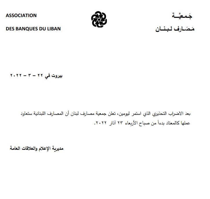 أبرز العناوينبالوثيقة.. جمعية مصارف لبنان تعلن "فك" الإضراب غدًا محلياتبالوثيقة.. جمعية مصارف لبنان تعلن “فك” الإضراب غدًا18:11 2022 ,March 220275 أشار بيان صادر عن جمعية مصارف لبنان، إلى ان المصارف ستعاود عملها كالمعتاد غدًا بعد يومين من الإضراب التحذيري.كلمات مفتاحيةالاضرابجمعية المصارفمحليات FacebookTwitterPinterestWhatsAppTelegram الخبر السابقالحواط : في ١٥ أيار سيقترع اللبنانيون للحق وينبذون الباطلالخبر التاليمولوي: كلنا ثقة أن السعودية ستكون دائما الى جانب لبنان- إعلان - - إعلان - مقالات ذات صلة أبرز العناويناللواء إبراهيم : “الباسبورات” بعد العيد… 06:58 2022 ,May 2 أبرز العناوينبيان وزارة التربية حول الأقساط “كلام خطير” 07:29 2022 ,April 13 أبرز العناوينالقطيعة السعودية مستمرة مع العهد… البخاري في دار الفتوى اليوم وإفطار على شرف ميقاتي 06:52 2022 ,April 11 ترك الردالتعليق:من فضلك ادخل تعليقك اسم:*من فضلك ادخل اسمك هنا البريد الإلكتروني:*لقد أدخلت عنوان بريد إلكتروني غير صحيح!الرجاء إدخال عنوان بريدك الإلكتروني هنا الموقع: احفظ اسمي والبريد الإلكتروني وموقع الويب في هذا المتصفح للمرة الأولى التي أعلق فيها. - إعلانات - - إعلانات - الأكثر قراءةمأساة مؤلمة… ميشال جثّة داخل منزله! 11:38 2025 ,December 4 أوَّل معجزة تُسَجَّل بعد زيارة البابا ضريح مار شربل: رَنَّ هاتف الطبيب وصوتُ القديس يُعلِنُ الأعجوبة 15:24 2025 ,December 4 حادث مؤسف يطال النائب افرام قبيل زيارة الحبر الأعظم… فهل يشارك؟ 19:41 2025 ,November 29 جريمة مروّعة نفّذها سوريّان… ودعوات لضبط النفس 12:02 2025 ,December 4 المزيد- إعلانات - - إعلانات - - إعلان - - إعلان -