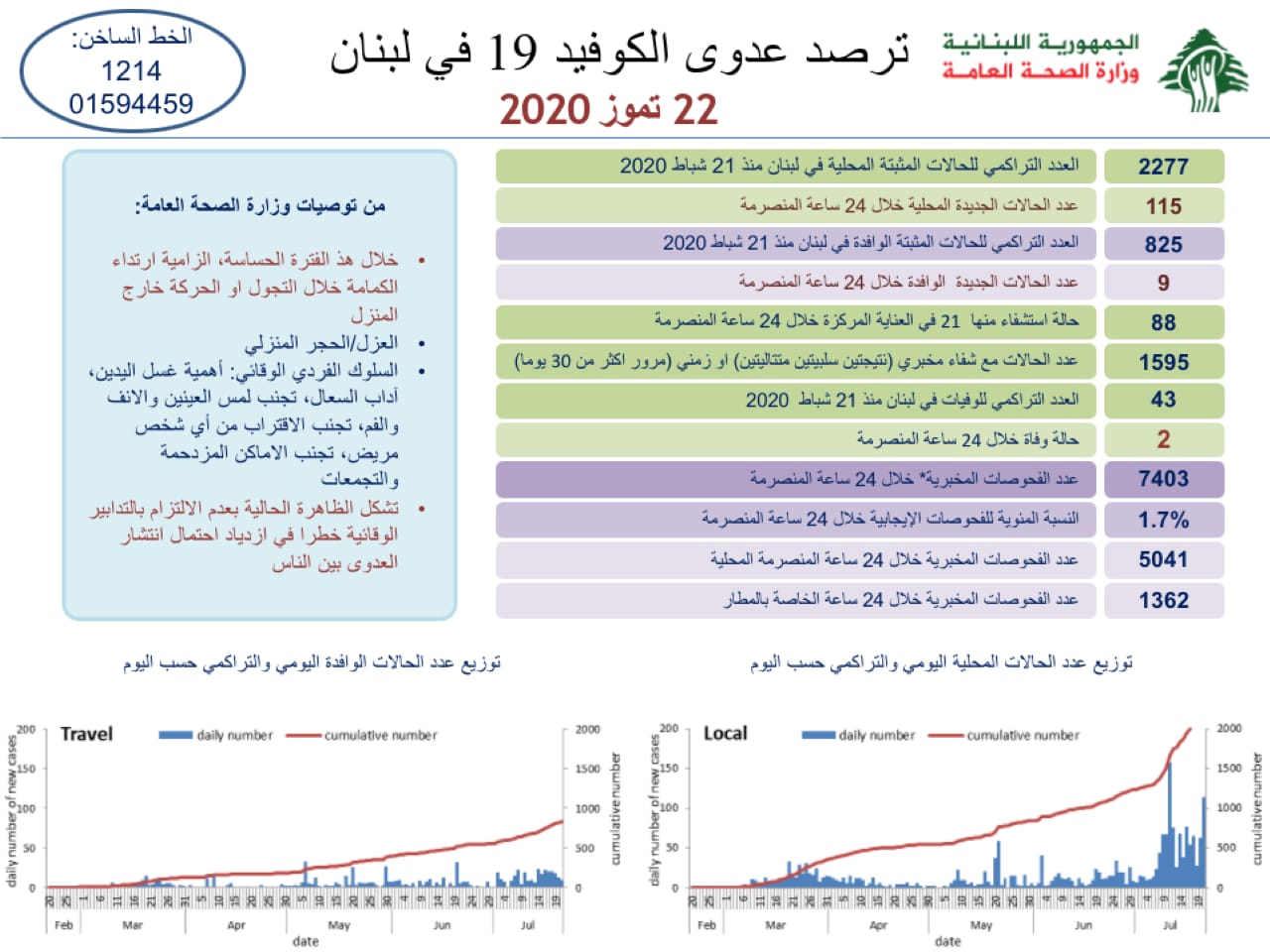 محلياتصحّةوزارة الصحة: حالتا وفاة و124 إصابة جديدة في لبنان صحّةوزارة الصحة: حالتا وفاة و124 إصابة جديدة في لبنان19:57 2020 ,July 220532 اعلنت وزارة الصحة العامة تسجيل 124 اصابة كورونا جديدة رفعت العدد التراكمي للحالات المثبتة الى 3104. FacebookTwitterPinterestWhatsAppTelegram الخبر السابقالحواط : هنيئاً للمجلس الدستوري إسقاط آلية التعيينات.الخبر التالياصابة جديدة بالكورونا في عمشيت لشاب- إعلان - - إعلان - ترك الردالتعليق:من فضلك ادخل تعليقك اسم:*من فضلك ادخل اسمك هنا البريد الإلكتروني:*لقد أدخلت عنوان بريد إلكتروني غير صحيح!الرجاء إدخال عنوان بريدك الإلكتروني هنا الموقع: احفظ اسمي والبريد الإلكتروني وموقع الويب في هذا المتصفح للمرة الأولى التي أعلق فيها. - إعلانات - - إعلانات - الأكثر قراءةمأساة مؤلمة… ميشال جثّة داخل منزله! 11:38 2025 ,December 4 أوَّل معجزة تُسَجَّل بعد زيارة البابا ضريح مار شربل: رَنَّ هاتف الطبيب وصوتُ القديس يُعلِنُ الأعجوبة 15:24 2025 ,December 4 حادث مؤسف يطال النائب افرام قبيل زيارة الحبر الأعظم… فهل يشارك؟ 19:41 2025 ,November 29 جريمة مروّعة نفّذها سوريّان… ودعوات لضبط النفس 12:02 2025 ,December 4 المزيد- إعلانات - - إعلانات - - إعلان - - إعلان -