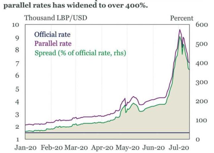 أضاف: في حين تم تثبيت السعر الرسمي عند 1507 ليرات لبنانية للدولار منذ العام 1998، استمر سعر الصرف في السوق الموازية في الانخفاض إلى متوسط 8600 ليرة لبنانية خلال الأيام الـ 11 الأولى من تموز الجاري، بسبب فقدان الثقة في قدرة السلطات المعنية الحالية على تنفيذ برنامج اقتصادي شامل (بيان 1).