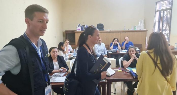 وقرابة السابعة وصلت الى مركز الاقتراع بعثة الاتحاد الاوروبي لمراقبة الانتخابات حيث تفقدت عملية الاقتراع، واطلعت على سير العملية الانتخابية التي جرت طوال هذا النهار