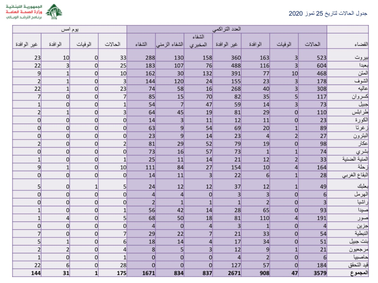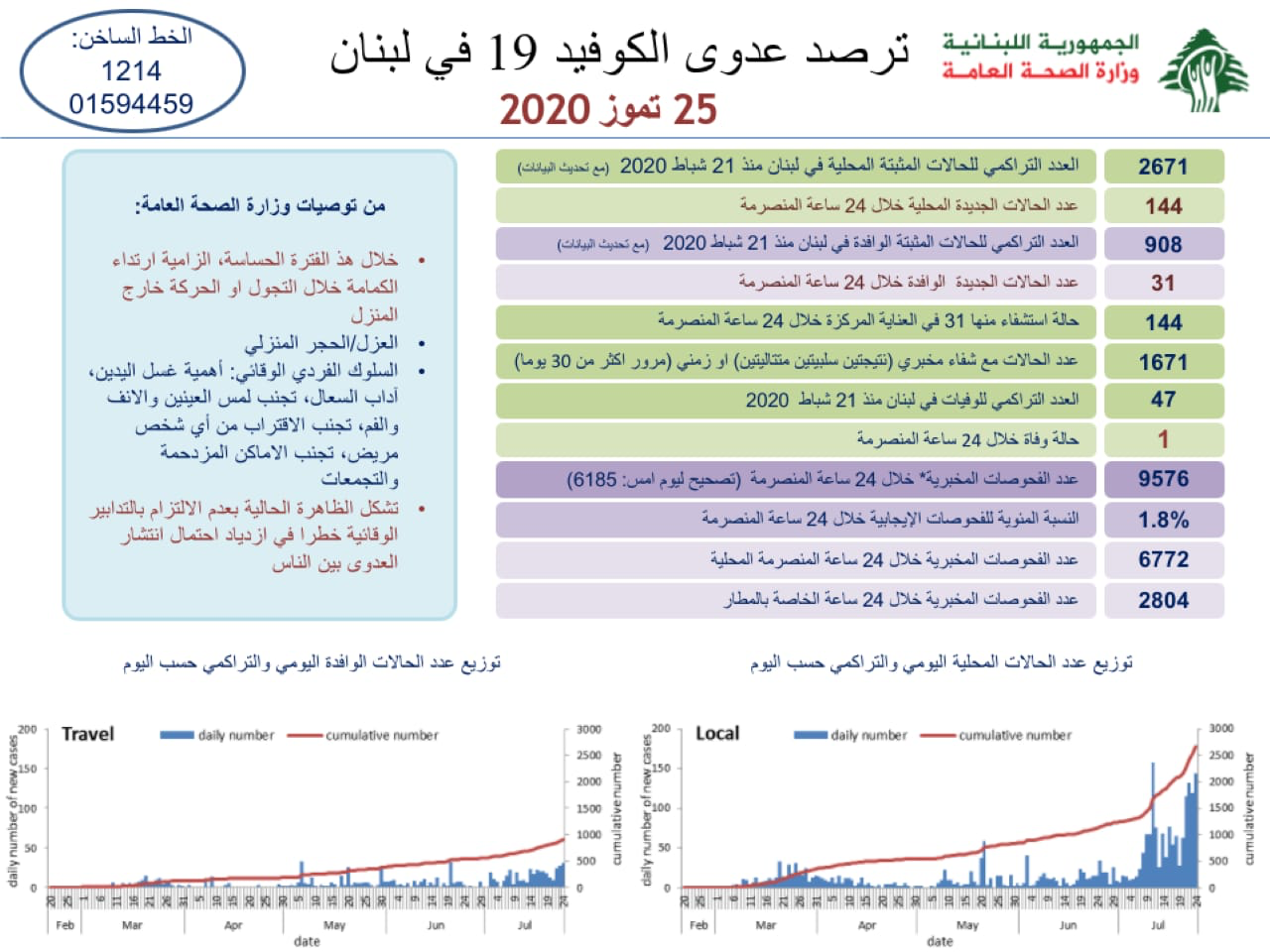 أبرز العناوينوزارة الصحة : 175 إصابة جديدة بـ”كورونا” وحالة وفاة صحّةوزارة الصحة : 175 إصابة جديدة بـ”كورونا” وحالة وفاة20:27 2020 ,July 250739 اعلنت وزارة الصحة العامة تسجيل 175 اصابة كورونا جديدة رفعت العدد التراكمي للحالات المثبتة الى 3582. FacebookTwitterPinterestWhatsAppTelegram الخبر السابقعقيص: كنت على تواصل مع جعجع والتقيت ببريالخبر التاليأفادت معلومات “الجديد” بأن رئيس مجلس النواب نبيه بري أجرى فحص الكورونا وينتظر النتائج في الساعات القليلة المقبلة.- إعلان - - إعلان - ترك الردالتعليق:من فضلك ادخل تعليقك اسم:*من فضلك ادخل اسمك هنا البريد الإلكتروني:*لقد أدخلت عنوان بريد إلكتروني غير صحيح!الرجاء إدخال عنوان بريدك الإلكتروني هنا الموقع: احفظ اسمي والبريد الإلكتروني وموقع الويب في هذا المتصفح للمرة الأولى التي أعلق فيها. - إعلانات - - إعلانات - الأكثر قراءةمأساة مؤلمة… ميشال جثّة داخل منزله! 11:38 2025 ,December 4 أوَّل معجزة تُسَجَّل بعد زيارة البابا ضريح مار شربل: رَنَّ هاتف الطبيب وصوتُ القديس يُعلِنُ الأعجوبة 15:24 2025 ,December 4 حادث مؤسف يطال النائب افرام قبيل زيارة الحبر الأعظم… فهل يشارك؟ 19:41 2025 ,November 29 جريمة مروّعة نفّذها سوريّان… ودعوات لضبط النفس 12:02 2025 ,December 4 المزيد- إعلانات - - إعلانات - - إعلان - - إعلان -