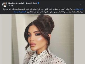 وكتبت الأحمدية: “دينا حايك من ٢٥ يوليو- تموز مختفية وبطلبها تلفون وما بترد! يعني في شي.. قلبي هيك بيقول.. الله يحميها ويبعتلا السلامة والرحمة والعافية.. وإنتو معي اطلبولا الخير من رب العالمين”.