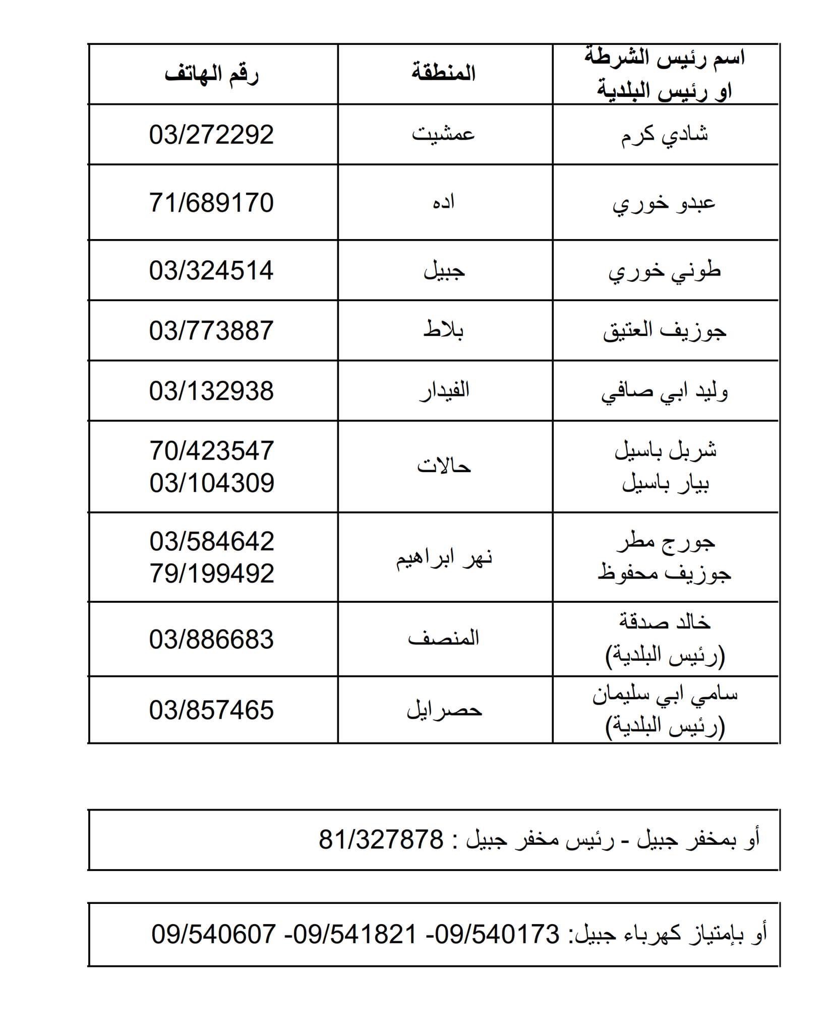وطلبت من جميع المشتركين ابلاغ إمتياز كهرباء جبيل أو شرطة بلديتهم او مخفر الدرك عن اي إشتباه بمحاولة سرقة كابلات خدمة للمصلحة العامة، والإتصال برئيس البلدية او شرطة البلديات على الأرقام التالية: