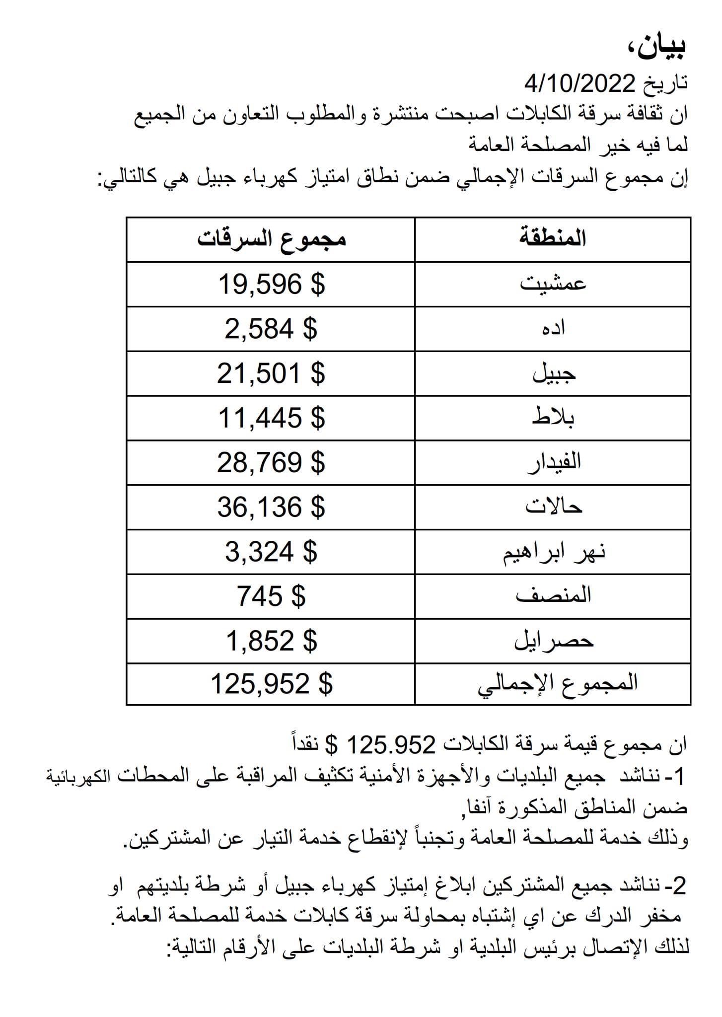 أعلنت شركة بيبلوس للتعهدات الكهربائية التابعة لإمتياز كهرباء جبيل في بيان مجموع السرقات التي طالتها في عدّة مناطق وأتت على الشكل التالي: “ثقافة سرقة الكابلات اصبحت منتشرة والمطلوب التعاون من الجميع لما فيه خير المصلحة العامة إن مجموع السرقات الإجمالي ضمن نطاق امتياز كهرباء جبيل هي كالتالي: