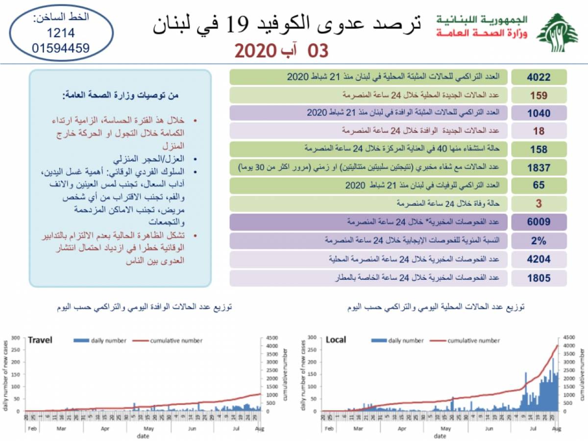 محلياتصحّةوزارة الصحة: تسجيل 177 إصابة جديدة بفيروس كورونا و3 حالات وفاة صحّةوزارة الصحة: تسجيل 177 إصابة جديدة بفيروس كورونا و3 حالات وفاة18:29 2020 ,August 30469 أكدت وزارة الصحّة العامة ان “177 إصابة جديدة بفيروس كورونا المستجد، كوفيد 19”.وأشارت وزارة الصحة في بيانها اليومي، انه “سجل وفاة 3 حالات مصابة بالفيروس”. FacebookTwitterPinterestWhatsAppTelegram الخبر السابقفحوصات جميع العاملين في فرع هواتشيكن -جبيل سلبيةالخبر التاليبلدية العاقورة : نعتزّ بتوزير شربل وهبي- إعلان - - إعلان - ترك الردالتعليق:من فضلك ادخل تعليقك اسم:*من فضلك ادخل اسمك هنا البريد الإلكتروني:*لقد أدخلت عنوان بريد إلكتروني غير صحيح!الرجاء إدخال عنوان بريدك الإلكتروني هنا الموقع: احفظ اسمي والبريد الإلكتروني وموقع الويب في هذا المتصفح للمرة الأولى التي أعلق فيها. - إعلانات - - إعلانات - الأكثر قراءةمأساة مؤلمة… ميشال جثّة داخل منزله! 11:38 2025 ,December 4 أوَّل معجزة تُسَجَّل بعد زيارة البابا ضريح مار شربل: رَنَّ هاتف الطبيب وصوتُ القديس يُعلِنُ الأعجوبة 15:24 2025 ,December 4 حادث مؤسف يطال النائب افرام قبيل زيارة الحبر الأعظم… فهل يشارك؟ 19:41 2025 ,November 29 جريمة مروّعة نفّذها سوريّان… ودعوات لضبط النفس 12:02 2025 ,December 4 المزيد- إعلانات - - إعلانات - - إعلان - - إعلان -