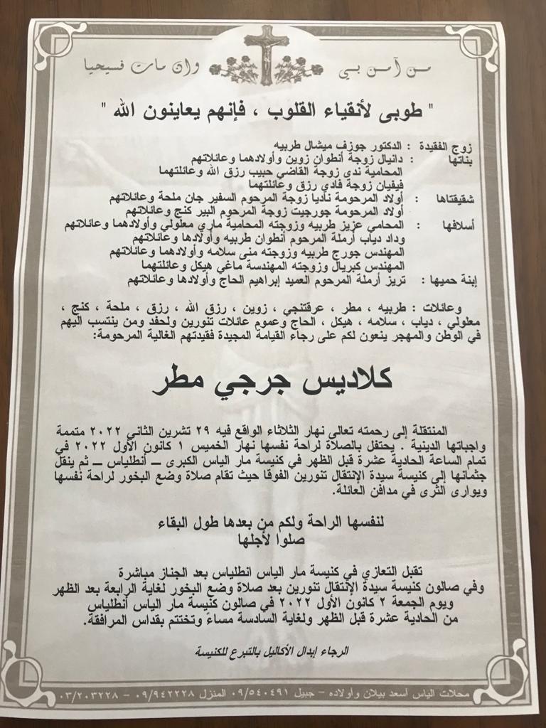 الدكتور جوزف طربية السيدة كلاديس جرجي مطر ، يحتفل بالصلاة لراحة نفسها عند الساعة الحادية عشرة من قبل ظهر غد الخميس في كنيسة مار الياس الكبرى – انطلياس ثم ينقل جثمانها الى كنيسة سيدة الانتقال -تنورين الفوقا حيث تقام صلاة وضع البخور لراحة نفسها ويوارى الثرى في مدافن العائلة