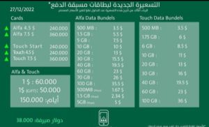 سجلت أسعار بطاقات التشريج ارتفاعاً كبيراً في الأسعار، مع ارتفاع دولار منصة صيرفة إلى الـ 38 ألف ليرة. وأصبحت الأسعار كالآتي: كارت mtc شهر 4.5$ 210000L.L كارت mtc شهر 7.58$ 340000L.L كارت mtc صغير ١٠ أيام 3.79$ 180000L.L كارت alfa شهر 4.5$ 205000L.L كارت alfa شهر 7.58$ 235000L.L كارت alfa صغير 3.03$ 145000L.L شهر mtc أو alfa مع 1.34$ 100000L.L ٣ أشهر mtc أو alfa مع 5$ 300000L.L أسعار الدولارات : 1$ 50000L.L 2$ 90000L.L 3$ 120000L.L 5$ 200000LL 10$ 400000L.L