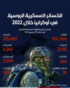 هذه خسائر الجيش الروسي في حربه على أوكرانيا خلال سنة 2022، وفق تقديرات تقريبية للقوات المسلحة الأوكرانية.