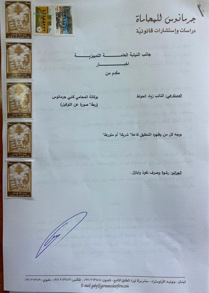 قدم عضو تكتل “الجمهورية القوية” النائب زياد الحواط اليوم بواسطة وكيله المحامي غابي جرمانوس إخباراً إلى النيابة العامة التمييزية عن موضوع حصر التحقيقات في ملفات فساد في الدوائر العقارية بمحافظة جبل لبنان فقط ، طالبا تعميم التحقيقات في كافة محافظات لبنان.