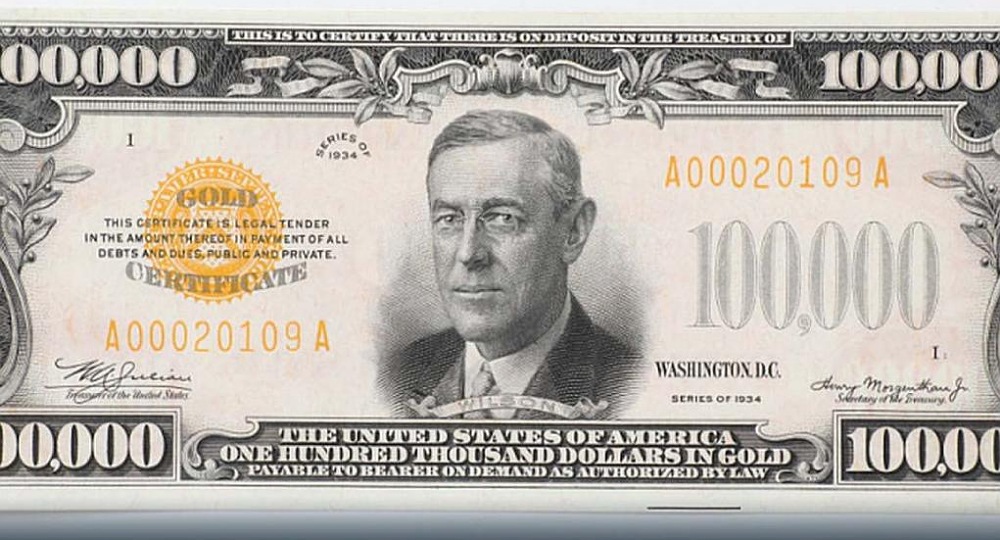 طبعت وزارة الخزانة الأميركية في عام 1934 عملة ورقية فئة 100 ألف دولار.