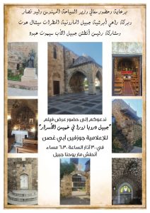 في اطار السياحة الدينية وقبيل حلول اسبوع الآلام تعرض الاعلامية جوزفين ابي غصن مساء الخميس في الثلاثين من آذار عند السادسة والنصف في انطش مار يوحنا مرقس جبيل فيلمها الاول من سلسلة “جبيل دروبا زورا ” بعنوان “جبيل دروبا زورا في خميس الاسرار”وذلك برعاية وحضور وزير السياحة المهندس وليد نصار وبركة وحضور راعي ابرشية جبيل المارونية المطران ميشال عون ومشاركة رئيس انطش جبيل الأب سيمون عبود .