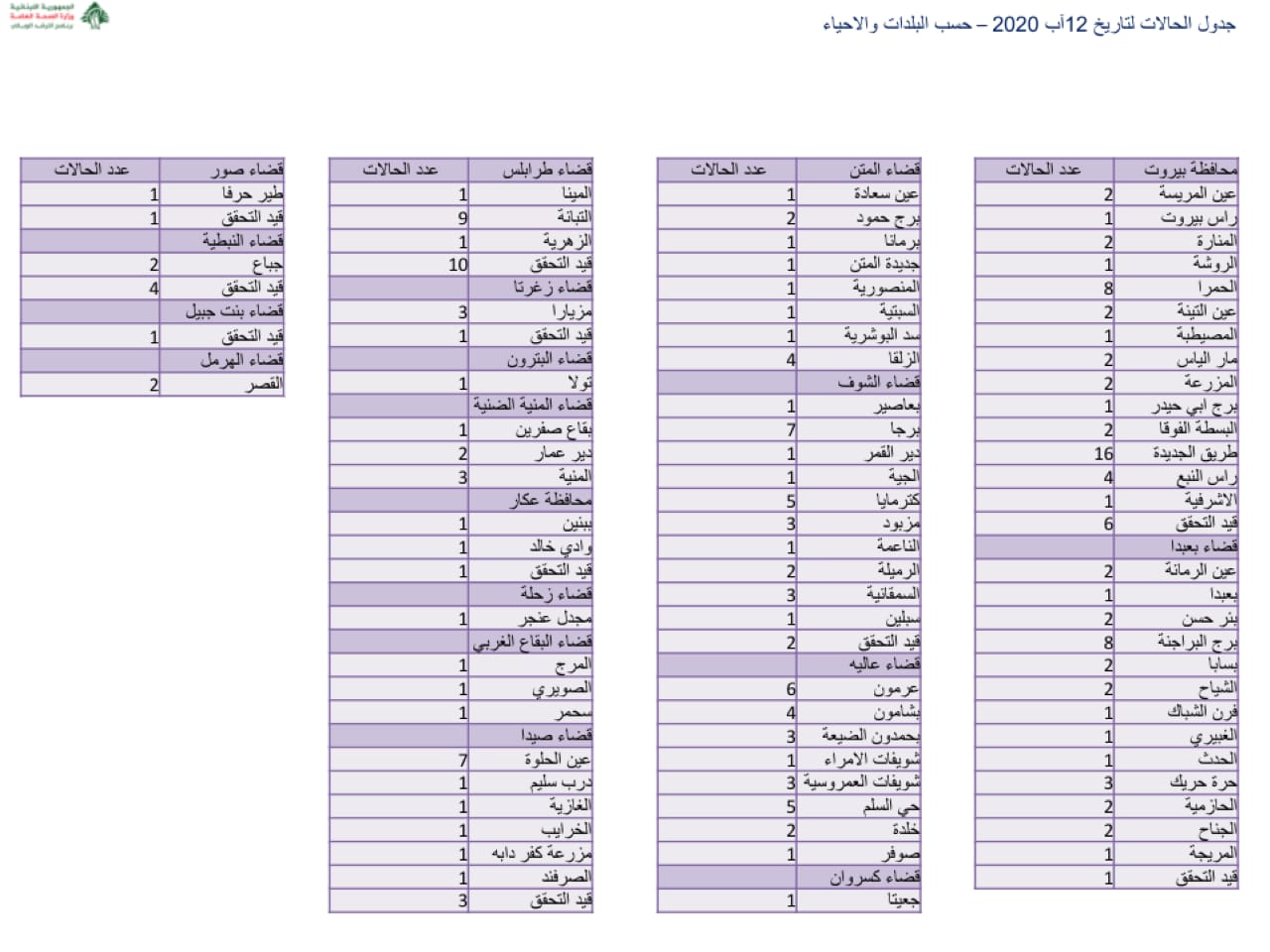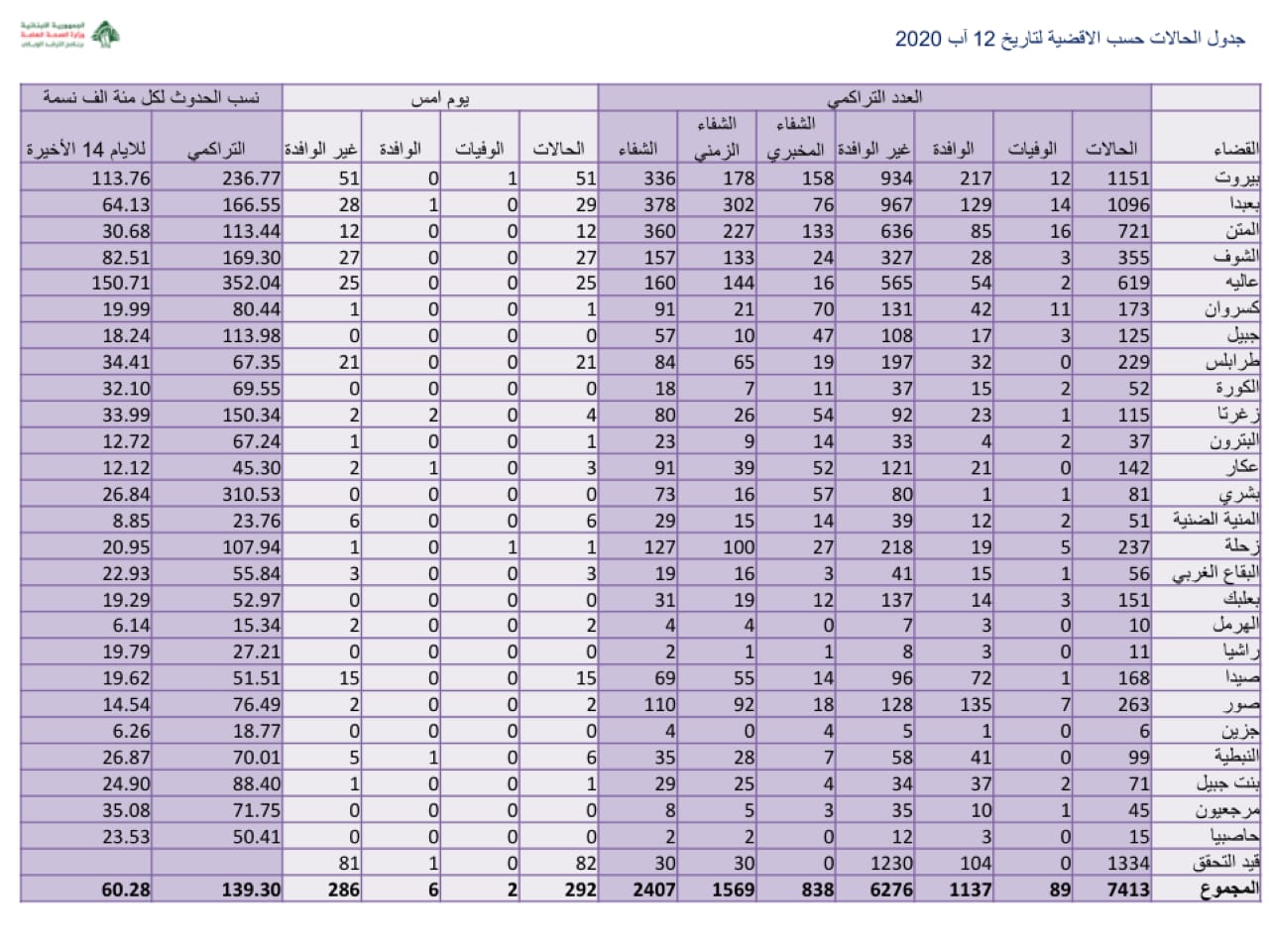 محلياتصحّةوزارة الصحة : حالتا وفاة و ٢٩٢ حالة جديدة بفيروس الكورونا صحّةوزارة الصحة : حالتا وفاة و ٢٩٢ حالة جديدة بفيروس الكورونا20:15 2020 ,August 120458 اعلنت وزارة الصحة العامة تسجيل 292 إصابة كورونا جديدة رفعت العدد التراكمي للحالات المثبتة الى 7413. FacebookTwitterPinterestWhatsAppTelegram الخبر السابقمشمش تودع ابنها الشهيد جو نون .الخبر التاليأسرار الصحف المحلية الصادرة يوم الخميس في ١٣ آب ٢٠٢٠- إعلان - - إعلان - ترك الردالتعليق:من فضلك ادخل تعليقك اسم:*من فضلك ادخل اسمك هنا البريد الإلكتروني:*لقد أدخلت عنوان بريد إلكتروني غير صحيح!الرجاء إدخال عنوان بريدك الإلكتروني هنا الموقع: احفظ اسمي والبريد الإلكتروني وموقع الويب في هذا المتصفح للمرة الأولى التي أعلق فيها. - إعلانات - - إعلانات - الأكثر قراءةمأساة مؤلمة… ميشال جثّة داخل منزله! 11:38 2025 ,December 4 أوَّل معجزة تُسَجَّل بعد زيارة البابا ضريح مار شربل: رَنَّ هاتف الطبيب وصوتُ القديس يُعلِنُ الأعجوبة 15:24 2025 ,December 4 حادث مؤسف يطال النائب افرام قبيل زيارة الحبر الأعظم… فهل يشارك؟ 19:41 2025 ,November 29 جريمة مروّعة نفّذها سوريّان… ودعوات لضبط النفس 12:02 2025 ,December 4 المزيد- إعلانات - - إعلانات - - إعلان - - إعلان -