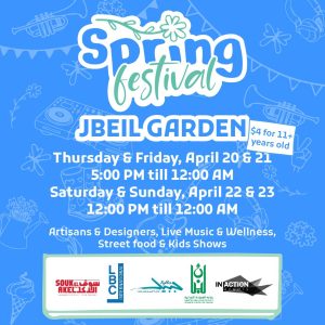تطلق بلديّة جبيل-بيبلوس “مهرجان الربيع” من تنظيم In Action Events و “سوق الأكل” و بالشراكة مع وزارة السياحة و LBCI، في حديقة جبيل العامة، من ٢٠ الى ٢٣ نيسان الجاري.