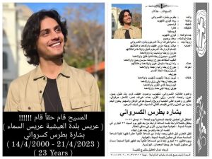 كالصاعقة وقع خبر رحيل الشاب بشارة الكسرواني إبن ال ٢٣ عاماً على عائلته وأبناء بلدته العيشية الجنوبيّة، حيث فُقد بعد ظهر الجمعة ٢١ نيسان ٢٠٢٣ ليتم العثور عليه جثّة هامدة بعد عدة ساعات في بحر جبيل.