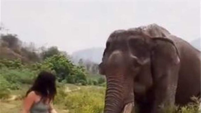 اقدم فيل عملاق على ضرب امرأة بخرطومه بعدما استفزته بقرن موز كانت تحمله، فما كان من المرأة الا ان طارت من شدة الضربة .