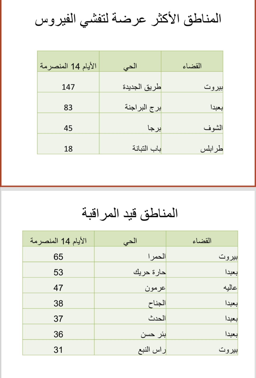 أكد وزير الصحة العامة في حكومة تصريف الأعمال الدكتور حمد حسن، خلال استقباله وفدا طبيا في دارته في مدينة بعلبك، أنه “بعد تسجيل أرقام ذروة بإصابات بفيروس كورونا المستجد، باشرت وزارة الصحة العامة بالتعاون مع البلديات عبر وزارة الداخلية والبلديات، عزل بعض الأحياء ضمن المناطق التالية: طريق الجديدة في العاصمة بيروت، برج البراجنة في قضاء بعبدا، برجا في قضاء الشوف، باب التبانة في طرابلس، ومراقبة تطور الوباء في المناطق التالية: رأس بيروت والحمرا في بيروت، حارة حريك والحدت وبئر حسن والجناح في قضاء بعبدا وعرمون في قضاء عاليه والتي قد نضطر إلى عزلها لاحقا”.