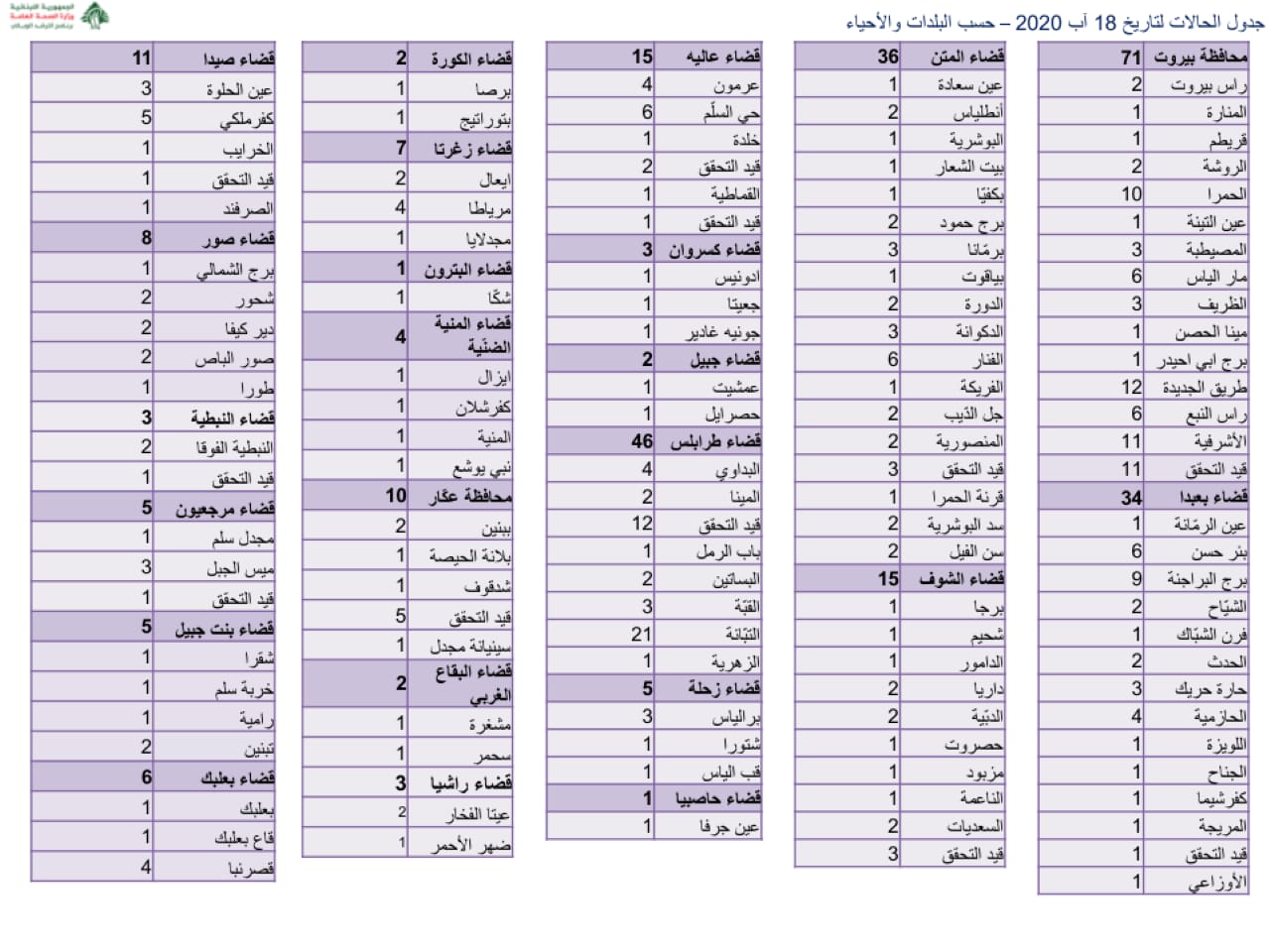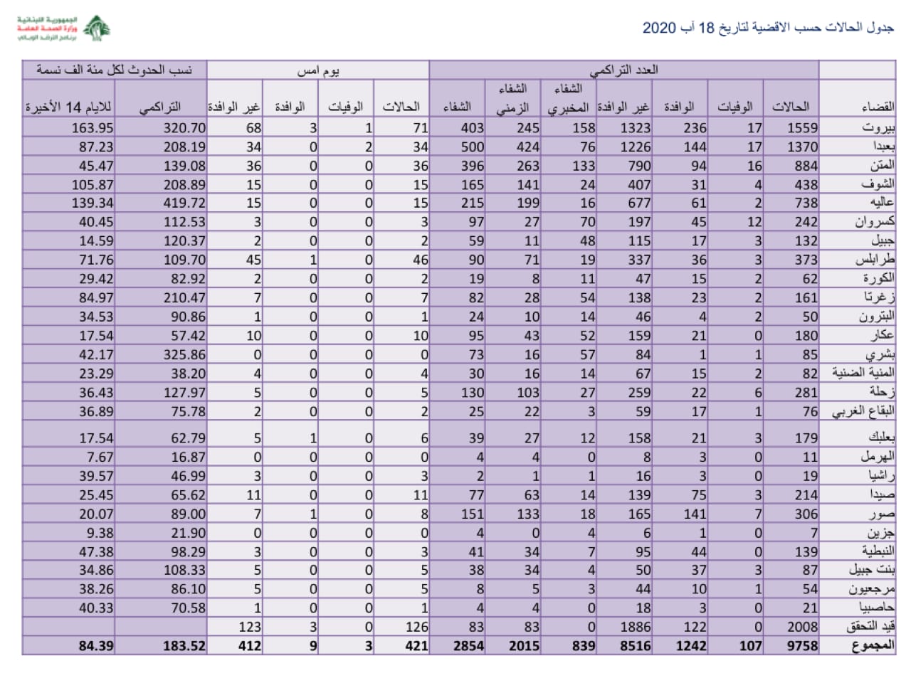 محلياتصحّةوزارة الصحة : حالتا وفاة و ٤٢١ اصابة جديدة بفيروس كورونا صحّةوزارة الصحة : حالتا وفاة و ٤٢١ اصابة جديدة بفيروس كورونا19:42 2020 ,August 180285 اعلنت وزارة الصحة العامة تسجيل 421 اصابة كورونا جديدة رفعت العدد التراكمي للحالات المثبتة الى 9758. FacebookTwitterPinterestWhatsAppTelegram الخبر السابقنتائج فحوصات المخالطين في المنصف جاءت سلبيةالخبر التاليواشنطن ترحّب بحكم بقرار المحكمة الدوليّة: حزب الله لا يدافع عن لبنان- إعلان - - إعلان - ترك الردالتعليق:من فضلك ادخل تعليقك اسم:*من فضلك ادخل اسمك هنا البريد الإلكتروني:*لقد أدخلت عنوان بريد إلكتروني غير صحيح!الرجاء إدخال عنوان بريدك الإلكتروني هنا الموقع: احفظ اسمي والبريد الإلكتروني وموقع الويب في هذا المتصفح للمرة الأولى التي أعلق فيها. - إعلانات - - إعلانات - الأكثر قراءةمأساة مؤلمة… ميشال جثّة داخل منزله! 11:38 2025 ,December 4 أوَّل معجزة تُسَجَّل بعد زيارة البابا ضريح مار شربل: رَنَّ هاتف الطبيب وصوتُ القديس يُعلِنُ الأعجوبة 15:24 2025 ,December 4 جريمة مروّعة نفّذها سوريّان… ودعوات لضبط النفس 12:02 2025 ,December 4 خاص-منشور للزميل عبدو متى يثير الجدل حول حضور سليم صفير لقاء الشبيبة في بكركي! 23:24 2025 ,December 1 المزيد- إعلانات - - إعلانات - - إعلان - - إعلان -
