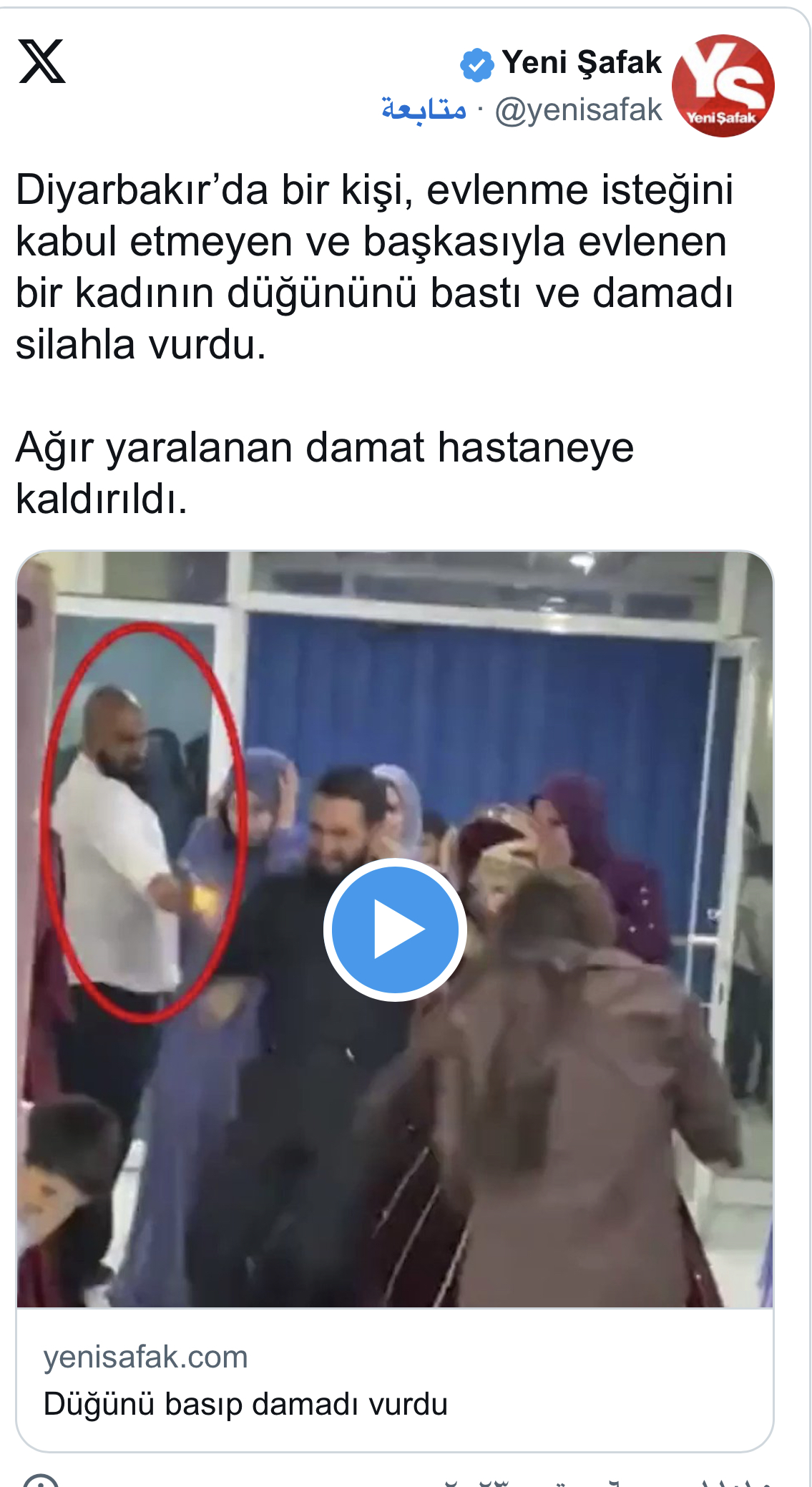 حادث مأساوي شهدته ولاية ديار بكر في تركيا، حيث رصدت عدسات الكاميرا اقتحام شاب لحفل زفاف وإطلاقه النار على العريس، وذلك بسبب أن العروس كانت قد رفضته عندما تقدم لخطبتها، فقرر الانتقام منها بإنهاء حياة عريسها.