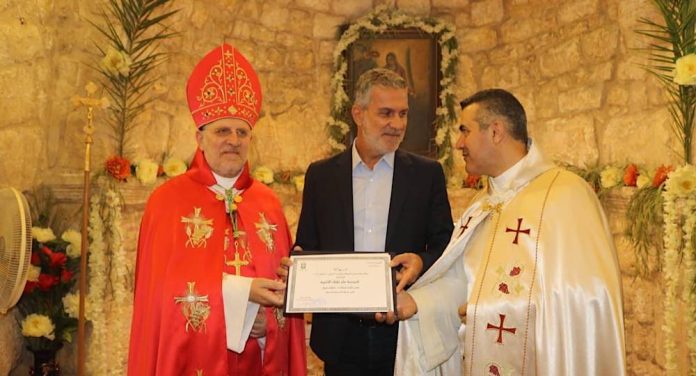 بعد ذلك سلّم نصار كل من المطران عون والخوري الراعي شهادة ادراج الكنيسة على الخريطة الدينية وتسلم من المختار جبران هدية رمزية عبارة عن صورة الكنيسة محفورة على صخرة وسلم بدوره لجبران درعا تقديرا لتفانيه في خدمة المواطنين كمختار للبلدة ورئيسا لرابطة المختارين في القضاء .