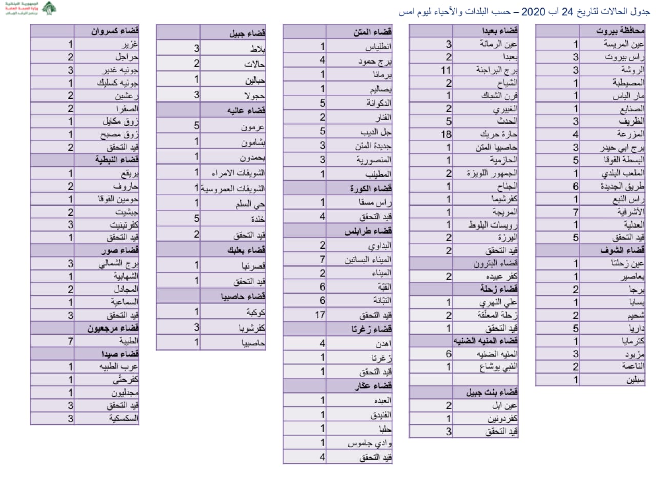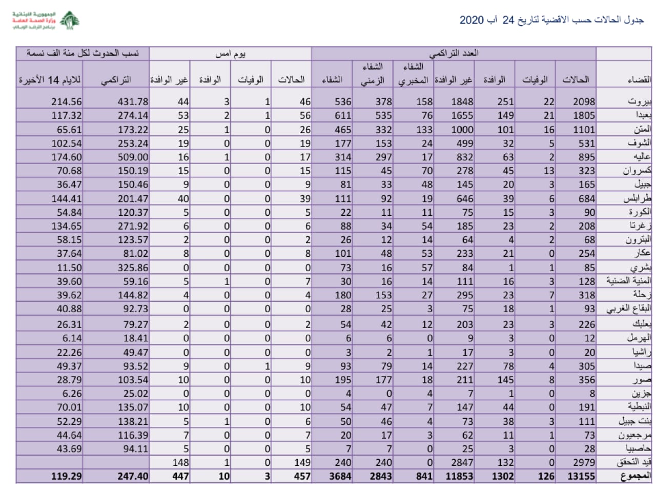 محلياتصحّةوزارة الصحة : ٣ حالات وفاة و ٤٥٧ اصابة جديدة بفيروس كورونا صحّةوزارة الصحة : ٣ حالات وفاة و ٤٥٧ اصابة جديدة بفيروس كورونا19:19 2020 ,August 240374 اعلنت وزارة الصحة العامة تسجيل ٤٥٧ اصابة كورونا جديدة رفعت العدد التراكمي للحالات المثبتة الى ١٣١٥٥ FacebookTwitterPinterestWhatsAppTelegram الخبر السابقالاستشارات لن تتجاوز نهاية الاسبوع على الارجح..عون لحكومة غير تقليدية واشراك المجتمع المدني؟!الخبر التاليمتخوّفا من اغتيالات.. نديم الجميل للنواب السياديين: انتبهوا!- إعلان - - إعلان - ترك الردالتعليق:من فضلك ادخل تعليقك اسم:*من فضلك ادخل اسمك هنا البريد الإلكتروني:*لقد أدخلت عنوان بريد إلكتروني غير صحيح!الرجاء إدخال عنوان بريدك الإلكتروني هنا الموقع: احفظ اسمي والبريد الإلكتروني وموقع الويب في هذا المتصفح للمرة الأولى التي أعلق فيها. - إعلانات - - إعلانات - الأكثر قراءةمأساة مؤلمة… ميشال جثّة داخل منزله! 11:38 2025 ,December 4 أوَّل معجزة تُسَجَّل بعد زيارة البابا ضريح مار شربل: رَنَّ هاتف الطبيب وصوتُ القديس يُعلِنُ الأعجوبة 15:24 2025 ,December 4 حادث مؤسف يطال النائب افرام قبيل زيارة الحبر الأعظم… فهل يشارك؟ 19:41 2025 ,November 29 جريمة مروّعة نفّذها سوريّان… ودعوات لضبط النفس 12:02 2025 ,December 4 المزيد- إعلانات - - إعلانات - - إعلان - - إعلان -