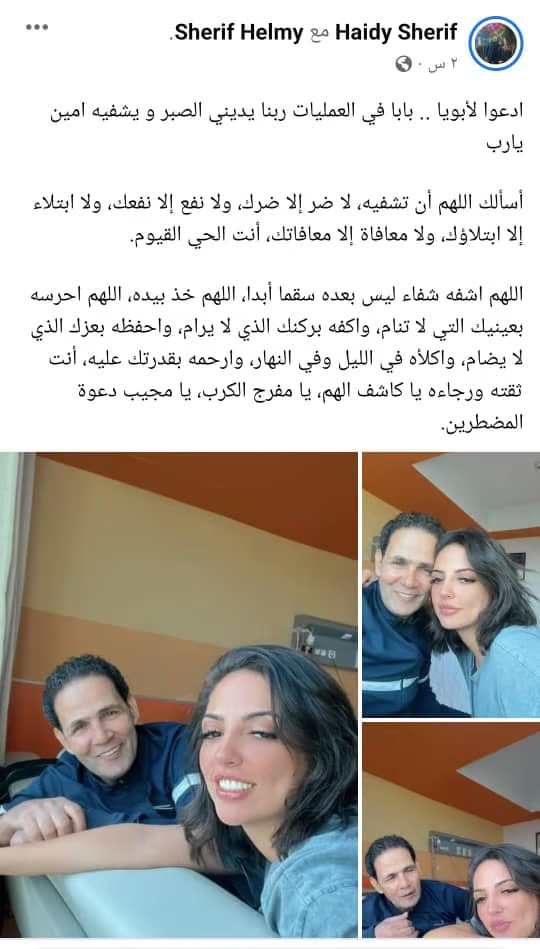 وكتبت هايدي: “ادعوا لأبويا، بابا في العمليات ربنا يديني الصبر ويشفيه أمين يارب، أسألك اللهم أن تشفيه، لا ضر إلا ضرك، ولا نفع إلا نفعك، ولا ابتلاء إلا ابتلاؤك، ولا معافاة إلا معافاتك، أنت الحي القيوم”.
