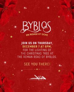 تدعوكم بلديّة جبيل-بيبلوس للمشاركة في افتتاح زينة الميلاد وإضاءة مغارة وشجرة العيد برعاية النّائب زياد الحوّاط، في الشارع الروماني وسط المدينة في ٧ كانون الأوّل و٢٠٢٣، السّاعة ٦ مساء. وستواكب فرقة Parade الاحتفال في السّوق، لإضفاء أجواء ميلاديّة في مختلف الشوّارع. وهذا العام يطغى اللونان الأحمر والذهبي على الزينة، وهي الألوان الرمزيّة للعيد، فالأحمر هو لون المحبّة والخير، أمّا اللون الذهبي فهو مرتبط بالعطاء والحكمة، والشجرة الخضراء بارتفاع ٢٥ متر، وعرض ١٠ مزيّنة بزهرة الميلاد الحمراء التي تدعى أيضاً “البونسيتيا” ، التي تشبه النجمة كدلالة على نجمة بيت لحم التي دلت الماجوس على الطفل يسوع.