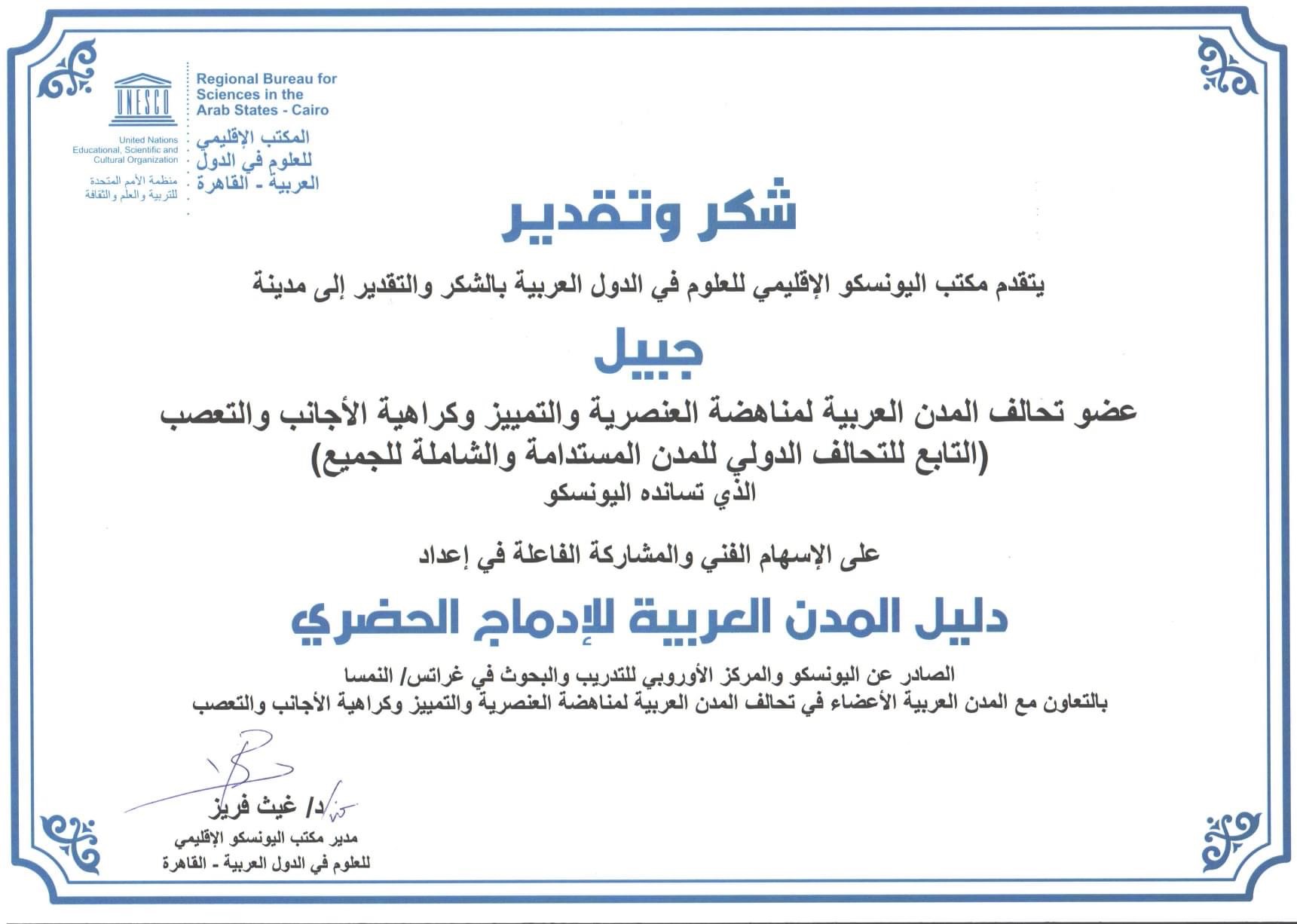 شهادة شكر وتقدير من مكتب “الأونسكو” الإقليمي لعلوم في الدول العربية، لمدينة جبيل