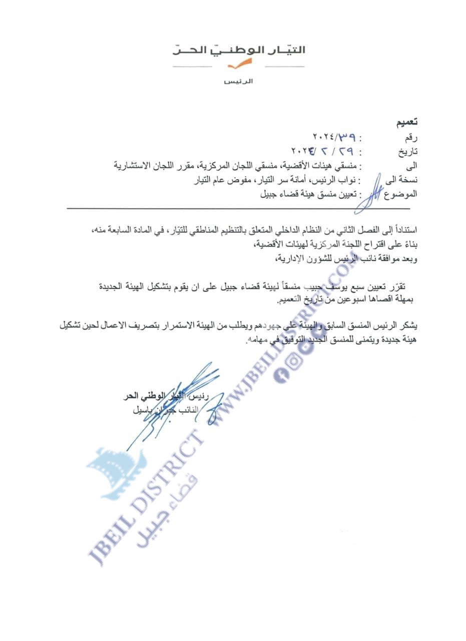 تقرر تعيين سبع يوسف حبيب منسقاً لهيئة قضاء جبيل على ان يقوم بتشكيل الهيئة الجديدة بمهلة اقصاها اسبوعين من تاريخ التعميم.