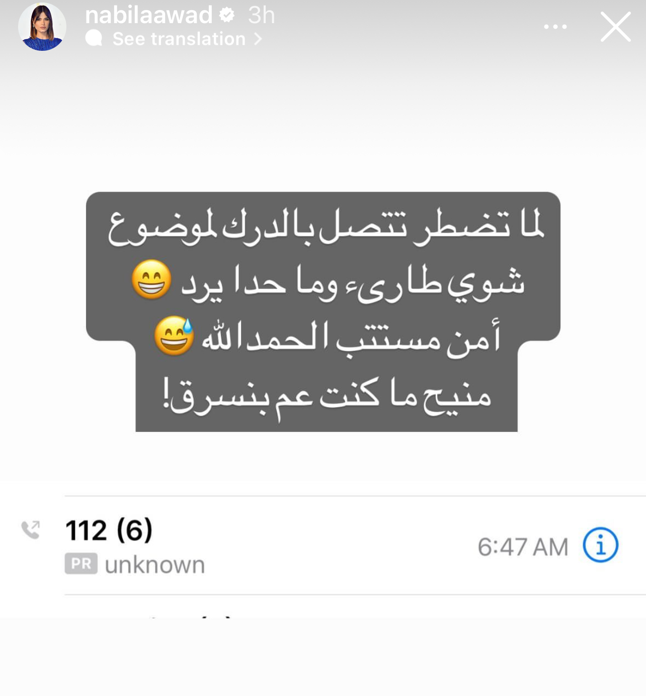 نشرت الإعلامية نبيلة عواد عبر خاصية الستوري على إنستغرام صورة تظهر إتصالها ٦ مرات بالرقم ١١٢ المخصص بالقوى الأمن الداخلي دون أن تتلقى أي إجابة، وعلّقت :” منيح ما كنت عم بنسرق!”
