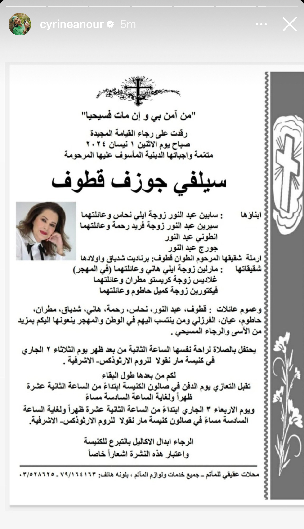 أعلنت الفنانة سيرين عبد النور وفاة والدتها مساء أمس الأحد بعد صراع مع مرض السرطان.
