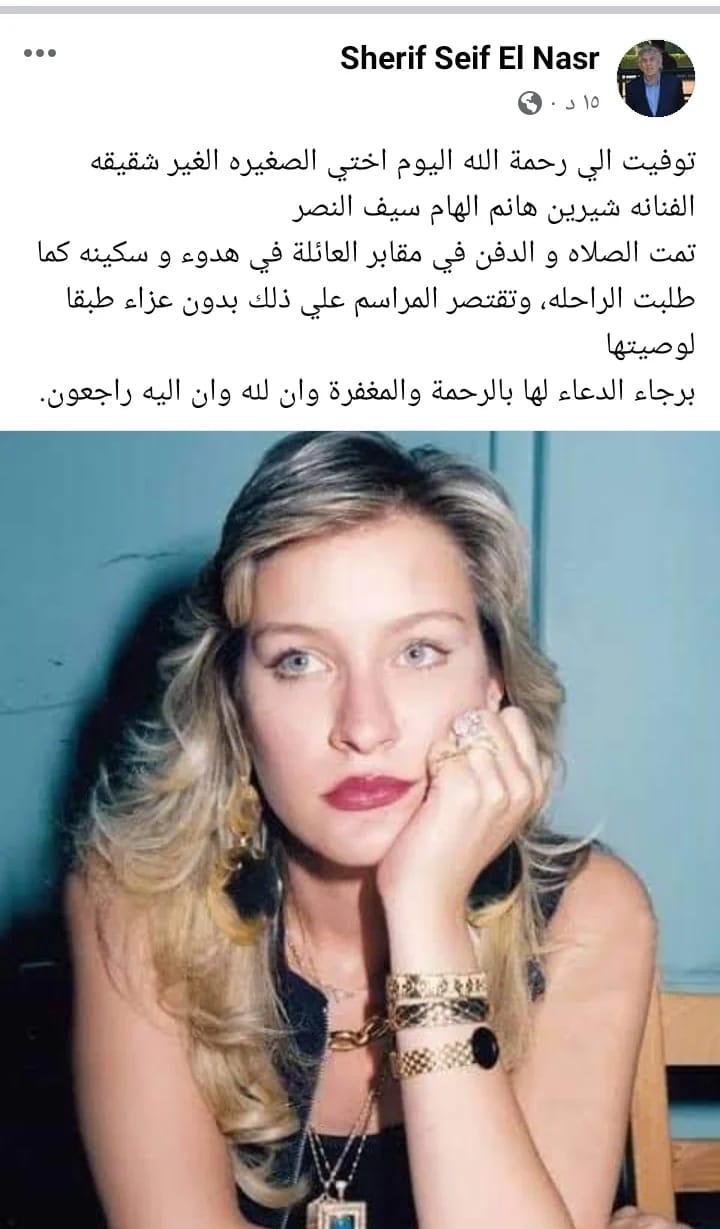 أخو شيرين أكد أنه تم دفنها بمقابر الأسرة، واستقبال العزاء فيها في هدوء تام بعيداً عن أضواء الإعلام، حسبما أوصتهم قبل رحيلها، داعياً الله لها بالرحمة.