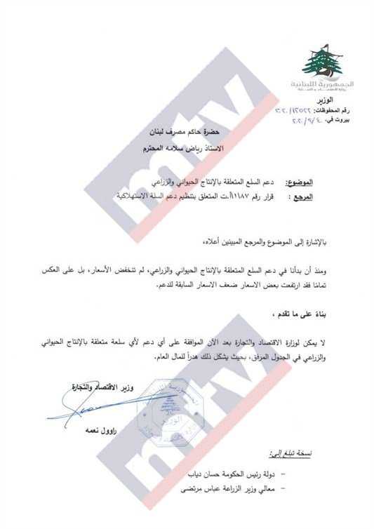 وأشارت الـ أم. تي. في الى أن الوزير أرسل كتاباً الى حاكم مصرف لبنان رياض سلامة يطلب فيه رفع الدعم عن السلع المتعلّقة بالإنتاج الحيواني والزراعي، لما يشكّله ذلك من هدرٍ للمال العام.