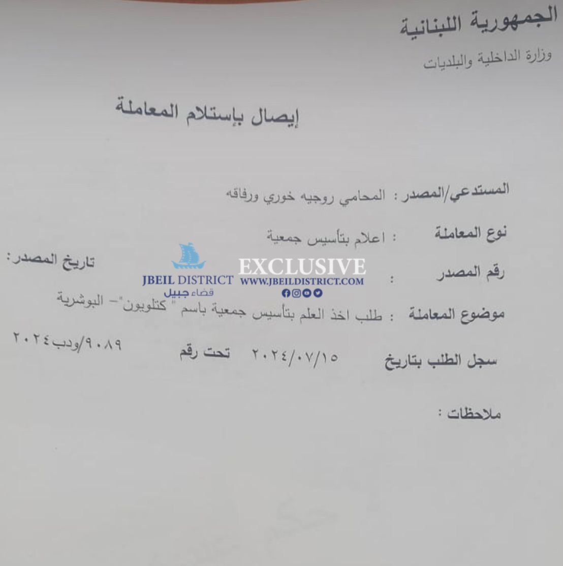 علم موقع “قضاء جبيل ” من مصادر مطلعة ان المحامي روجيه الخوري امين سر مجلس الحزب السابق في حزب الكتلة الوطنية اللبنانية ورفاقه تقدمو بطلب من وزارة الداخلية والبلديات بتاريخ اليوم ١٥-٧-٢٠٢٤ لأخذ العلم والخبر بتأسيس جمعية بإسم كتلويون مركزها البوشرية تحت الرقم : ٩٠٨٩/ودب٢٠٢٤