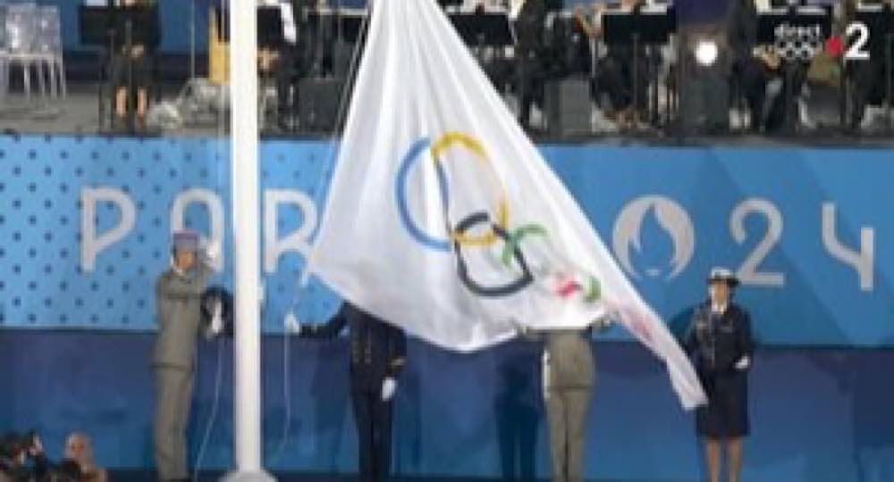 ورفع الحراس في نهاية حفل الافتتاح العلم بحلقاته الأولمبية الخمس على عمود في ساحة تروكاديرو بالقرب من برج إيفل، ولسوء الحظ، كان العلم معكوسًا حيث تم قلب الحلقتين السفليتين للرمز إلى الأعلى، والشكل المعتاد للعلم هو “ثلاث حلقات فوق حلقتين”.