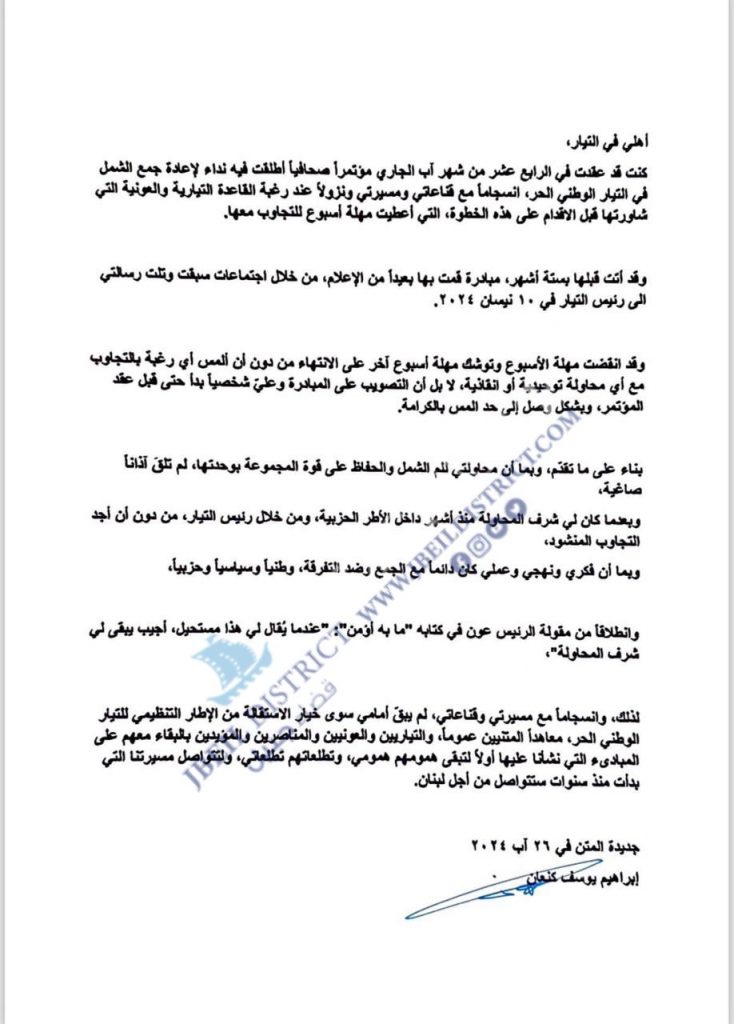 لذلك، وانسجاماً مع مسيرتي وقناعاتي، لم يبقّ أمامي سوى خيار الاستقالة من الإطار التنظيمي للتيار الوطني الحر، معاهداً المتنيين عموماً، والتياريين والعونيين والمناصرين والمؤيدين بالبقاء معهم على المبادىء التي نشأنا عليها أولاً لتبقى همومهم همومي، وتطلعاتهم تطلعاتي، ولتتواصل مسيرتنا التي بدأت منذ سنوات ستتواصل من أجل لبنان”.