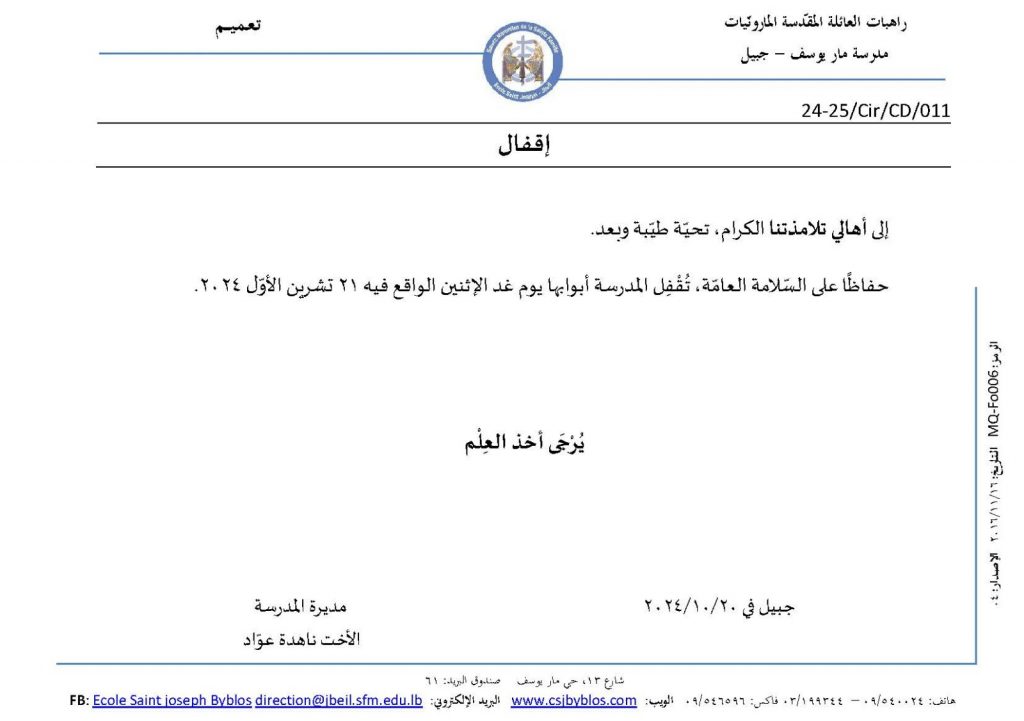 علم موقع قضاء جبيل ان ادارة ثانوية العائلة المقدسة في جبيل ابلغت اولياء طلابها عن اقفال ابوابها غدا .