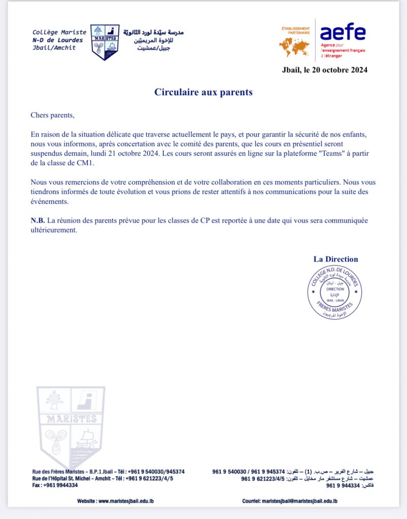 علم موقع”قضاء جبيل” ان مدرسة سيدة لورد الثانوية للإخوة المريميين جبيل – عمشيت أعلنت في بيان أنه نظراً للوضع الدقيق الذي تمر به البلاد حالياً، وحرصاً على سلامة أبنائنا، نعلمكم وبعد التشاور مع لجنة أولياء الأمور أنه سيتم تعليق الدراسة وجهاً لوجه غداً الاثنين 21 أكتوبر 2024.