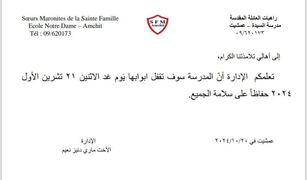 تعلمكم الإدارة أن المدرسة سوف تقفل ابوابها يوم غد الاثنين ۲۱ تشرين الأول ٢٠٢٤ حفاظاً على سلامة الجميع.