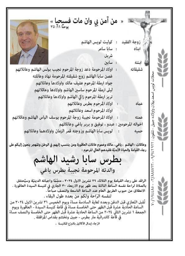 تقبل التعازي قبل الدفن وبعده لغاية السادسة مساءً ويوم الخميس ٣١ تشرين الأول ٢٠٢٤ من