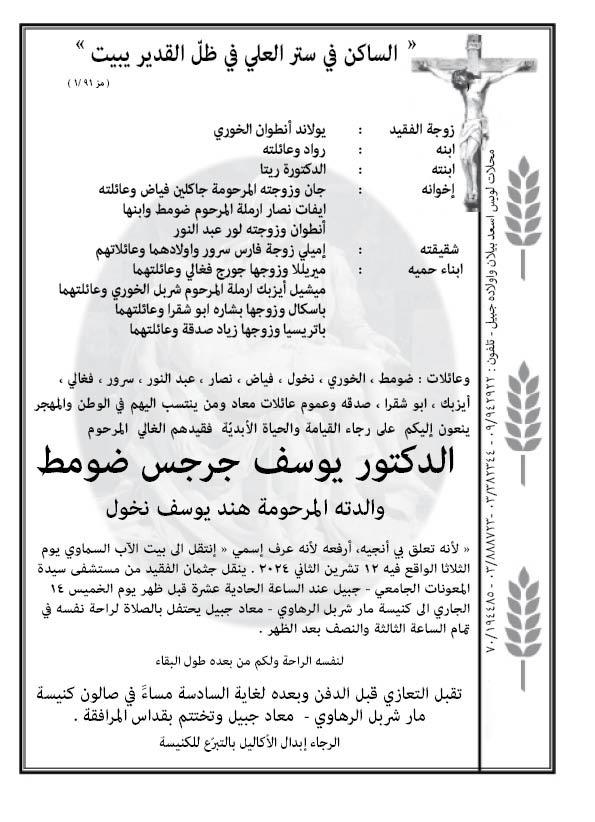 وقد عبر الى بيت الآب السماوي يوم الثلاثاء ۱۲ تشرين الثاني ٢٠٢٤ يحتفل بالصلاة لراحة نفسه يوم الخميس ١٤ تشرين الثاني الساعة ٣.٣٠ في كنيسة مار شربل الرهاوي – معاد . وتقبل التعازي قبل الدفن وبعده في صالون الكنيسة