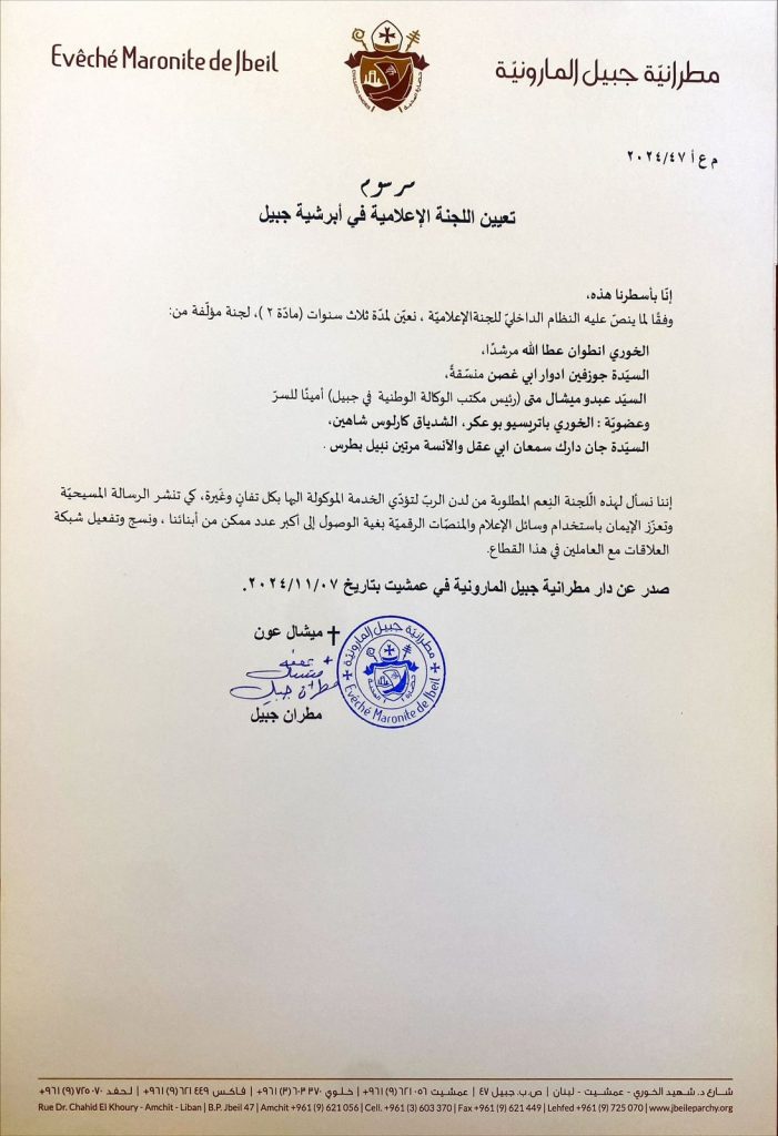 أصدر راعي ابرشية جبيل المارونية المطران ميشال عون مرسوما اعلن فيه عن تعيين اللجنة الاعلامية في ابرشية جبيل المارونية جاء فيه :انا بأسطرنا هذه ،وفقا لما ينص عليه النظام الداخلي للجنة الاعلامية ، نعين لمدة ثلاث سنوات: لجنة مؤلفة من :
