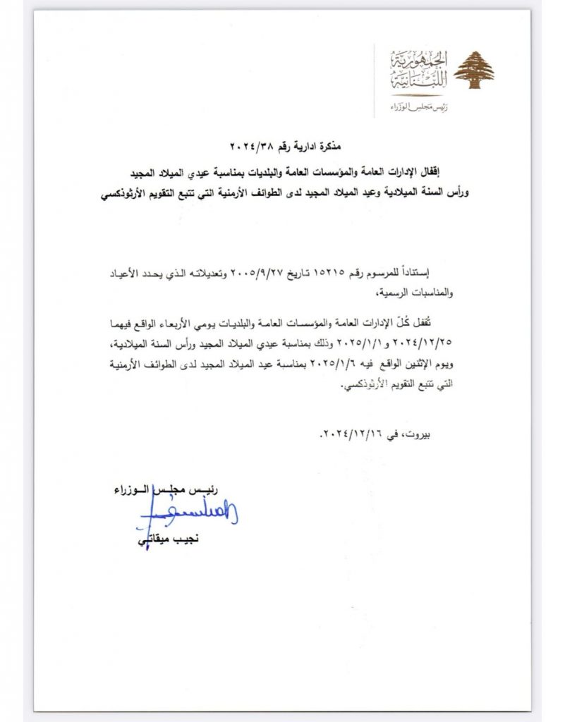 أبرز العناوينمجلس الوزراء يحدد عطلتي عيدي الميلاد ورأس السنة محلياتمجلس الوزراء يحدد عطلتي عيدي الميلاد ورأس السنة11:28 2024 ,December 170944 صدر عن مجلس الوزراء مذكرة بإقفال الإدارات والمؤسسات العامة والبلديات بمناسبة عيدي رأس السنة والميلاد وذلك يومي الأربعاء الواقع فيهما 25 -12 -2024 و 1-1-2025. FacebookTwitterPinterestWhatsAppTelegram الخبر السابقرئيس نادي الفيدار : مصلحة كرة الطائرة قبل أي شيء آخرالخبر التاليمؤتمر في جامعة AUT عن “التربية والتعليم في زمن الصراعات”- إعلان - - إعلان - - إعلانات - - إعلانات - الأكثر قراءةحادث مؤسف يطال النائب افرام قبيل زيارة الحبر الأعظم… فهل يشارك؟ 19:41 2025 ,November 29 مأساة مؤلمة… ميشال جثّة داخل منزله! 11:38 2025 ,December 4 أوَّل معجزة تُسَجَّل بعد زيارة البابا ضريح مار شربل: رَنَّ هاتف الطبيب وصوتُ القديس يُعلِنُ الأعجوبة 15:24 2025 ,December 4 إعلامي لبناني شهير يحتفل بخطوبته.. شاهدوا الصور والفيديو 10:31 2025 ,November 29 المزيد- إعلانات - - إعلانات - - إعلان - - إعلان -