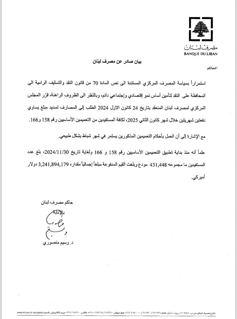 صدر عن مصرف لبنان بيان يطلب فيه من المصارف تسديد مبلغ يساوي دفعتين شهريتين، خلال شهر كانون الثاني 2025، لكل المستفيدين من التعميمَين الأساسيين رقم 158 و166.