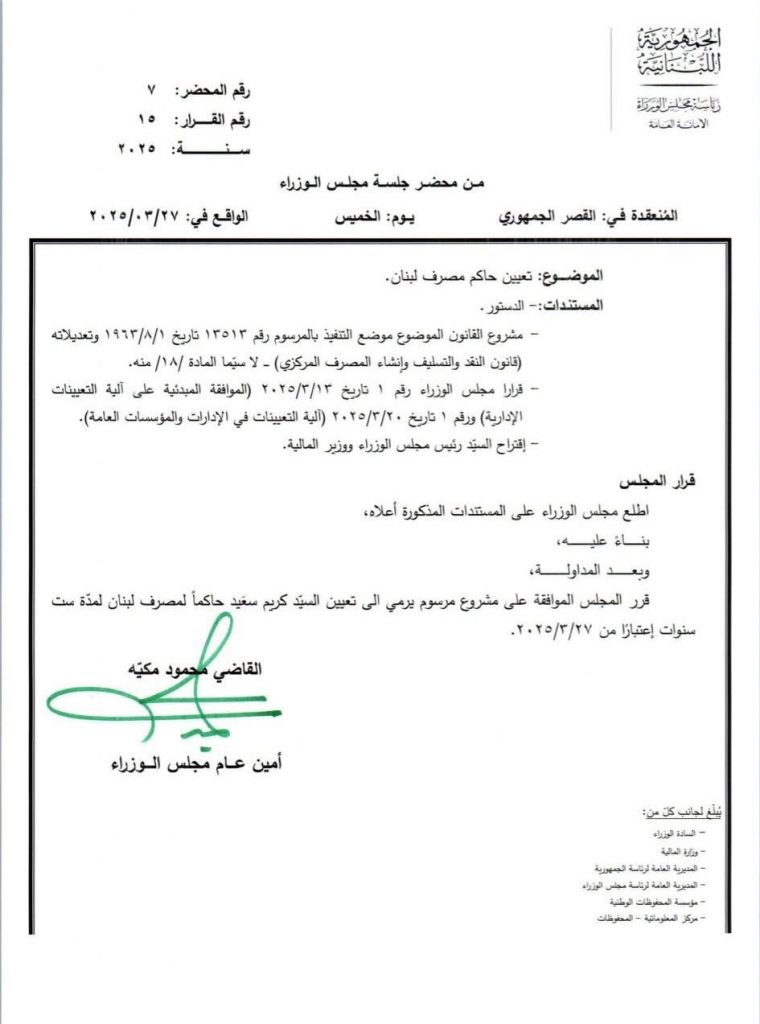 عيّن مجلس الوزراء كريم سعيد بالتصويت حاكماً لمصرف لبنان بعد نيله ١٧ صوتاً من أصل 24.